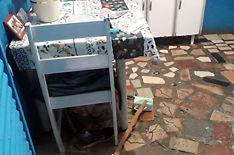 Logo na chegada a residência, os policiais flagraram o rapaz de posse de um pedaço de madeira quebrando janelas, portas e diversos objetos da casa. Ele ainda estava de posse de uma faca proferindo ameaças contra a idosa para que lhe desse dinheiro.