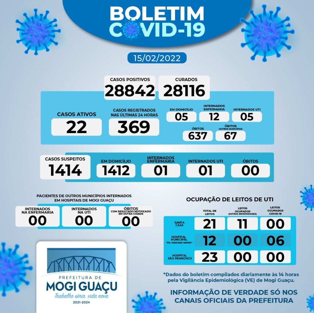 A cidade contabiliza ainda nesta terça 22 casos ativos, com cinco pessoas cumprindo as medidas de isolamento domiciliar e 17 internadas ´12 em enfermaria e cinco em UTI (Unidade de Terapia Intensiva).