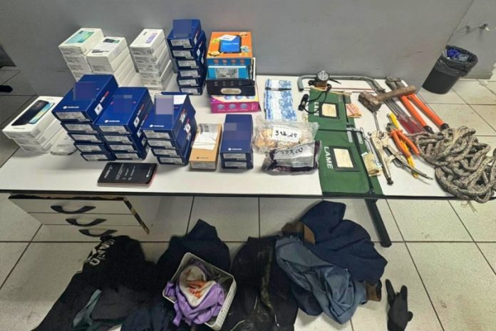Entre os materiais apreendidos estavam R$ 2.804,10 em dinheiro, 50 celulares, cinco tablets, além de ferramentas como cordas, três alicates, um serrote, um martelo, uma lanterna e duas chaves de fenda.