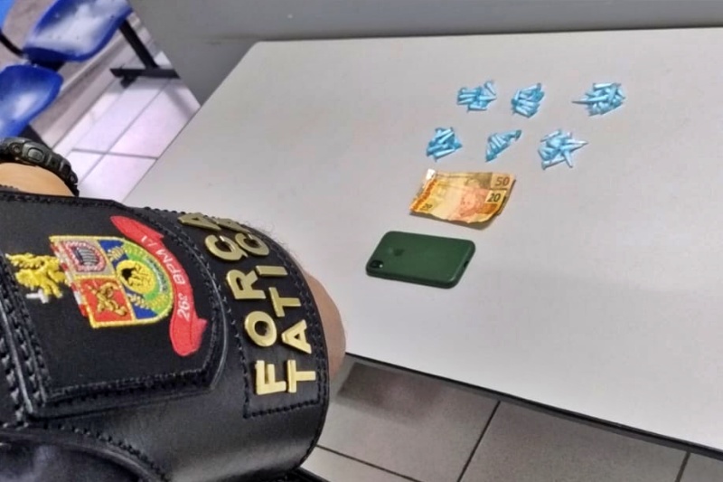 A Polícia Militar, por meio da equipe de Força Tática, prendeu um homem em flagrante por tráfico de drogas na noite desta quarta-feira (24), durante patrulhamento pela Praça Fernando de Noronha, na região do Jardim Itacolomy.