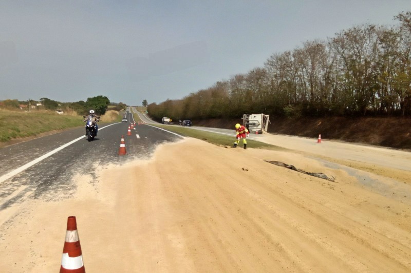 Ao realizar a manobra, ele perdeu o controle da direção, invadiu o canteiro central e acabou tombando o semi-reboque, o que provocou o derramamento parcial da carga de 45 toneladas de argila sobre o canteiro e parte das faixas de rolamento.