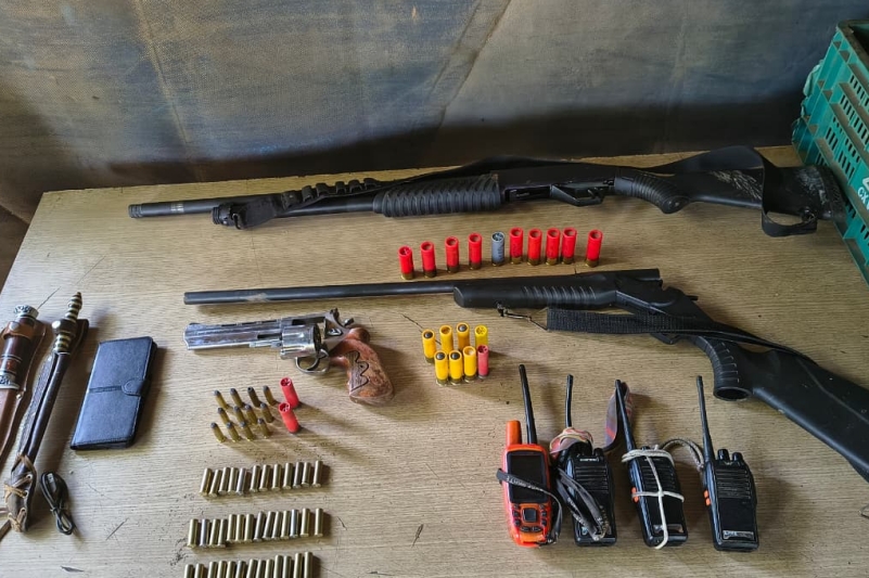 Durante a vistoria, foram localizadas três armas de fogo e diversas munições: um revólver calibre .357, uma espingarda calibre 12, uma espingarda calibre 20 e 32 munições de diversos calibres.