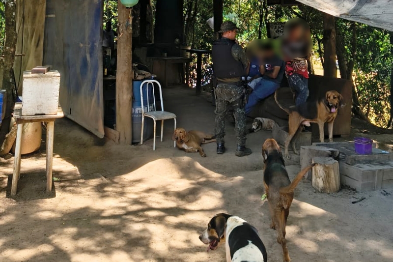 Ao chegarem a um rancho localizado próximo à margem, os policiais encontraram os suspeitos acompanhados de 12 cães utilizados para caça e um javali abatido, estimado em cerca de 100 quilos.