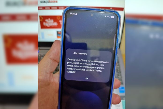 A mensagem enviada pelo órgão classificou a ocorrência como severa: “Alerta severo. Defesa Civil: Chuva forte se espalhando por Mogi Guaçu e Mogi Mirim. Tem vento, raios e condição para granizo. Atinge municípios vizinhos. Tenha cuidado!”