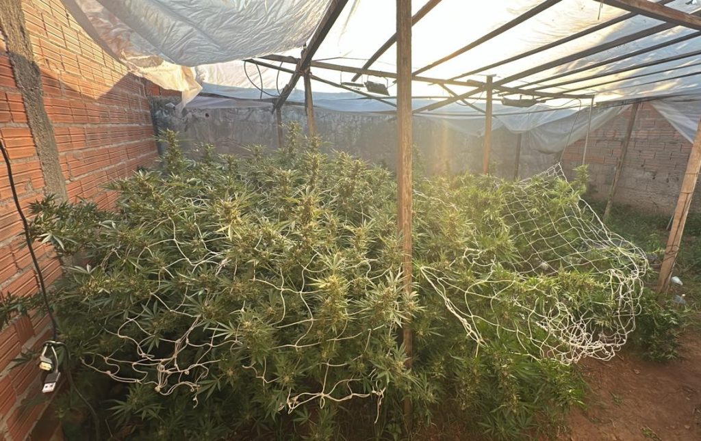 Durante o monitoramento, os policiais perceberam que havia uma estrutura instalada nos fundos da residência destinada ao cultivo da droga.