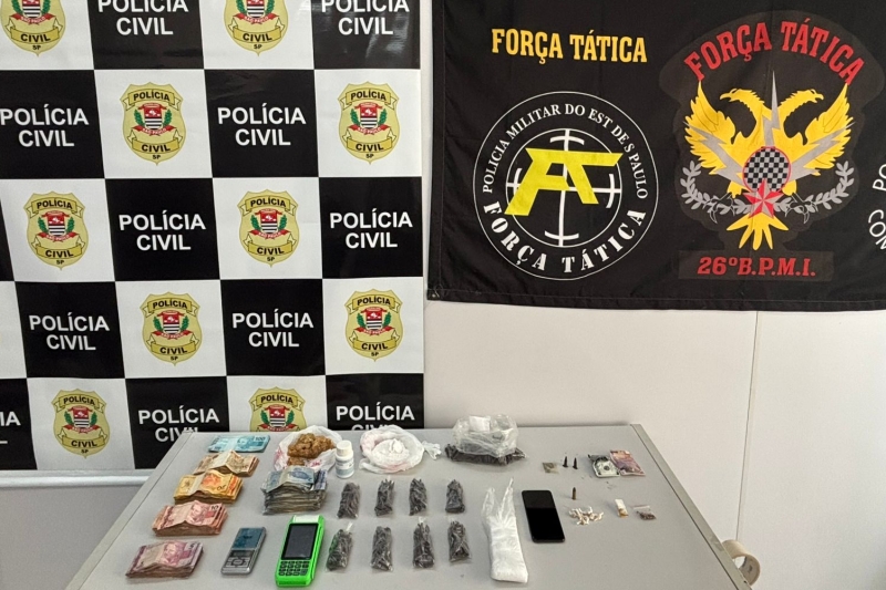 Durante as diligências, os policiais localizaram grande quantidade de entorpecentes e materiais ligados à comercialização ilegal. Ao todo, foram apreendidos 280 pinos com cocaína já fracionados para venda, 358 gramas de crack em bloco, 110 gramas de cocaína a granel, porções menores de crack e maconha — incluindo maconha do tipo “dry” — além de R$ 5.990,00 em dinheiro, em sua maioria em notas de pequeno valor.