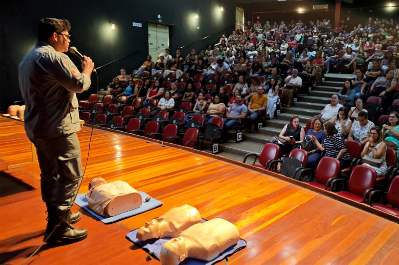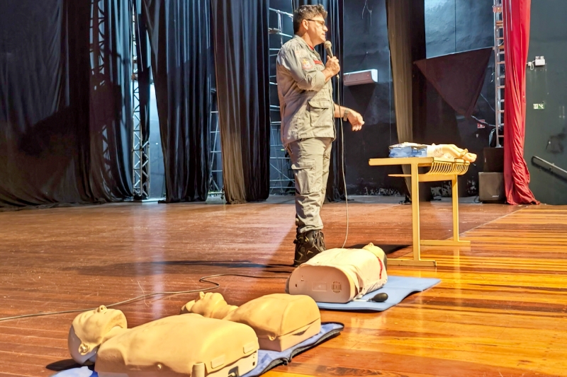 A atividade foi conduzida pelo bombeiro educador Cabo Leandro Augusto, que apresentou orientações práticas sobre como agir de forma rápida e segura em situações de emergência até a chegada de atendimento especializado.