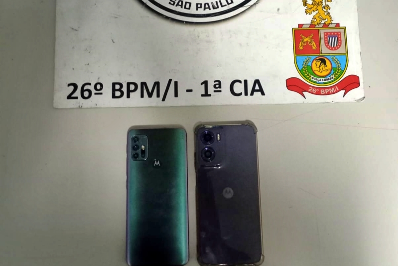 No local, os policiais abordaram dois suspeitos que demonstraram comportamento suspeito ao perceberem a presença da viatura. Durante a revista, um dos celulares foi encontrado na cintura de um deles, que alegou ter comprado o aparelho de uma mulher usuária de drogas.